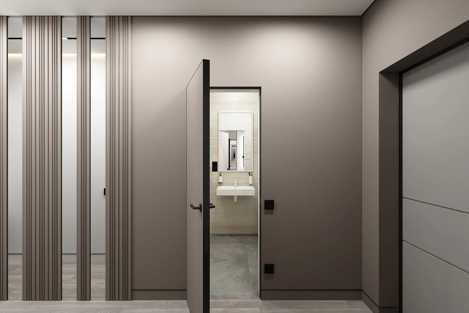 Ванна облицована светлой, широкоформатной плиткой из керамогранита. Текстура под камень с горизонтальным рисунком зрительно расширяет пространство. Белая сантехника, подвесная раковина, белый подвесной унитаз и в таком же цвете аксессуары. Шкафчики для хранения хозяйственных принадлежностей встроены и визуально сливаются со стенами, как и везде во всей квартире. Идеально вписались в пространство стиральная и сушильная машины.