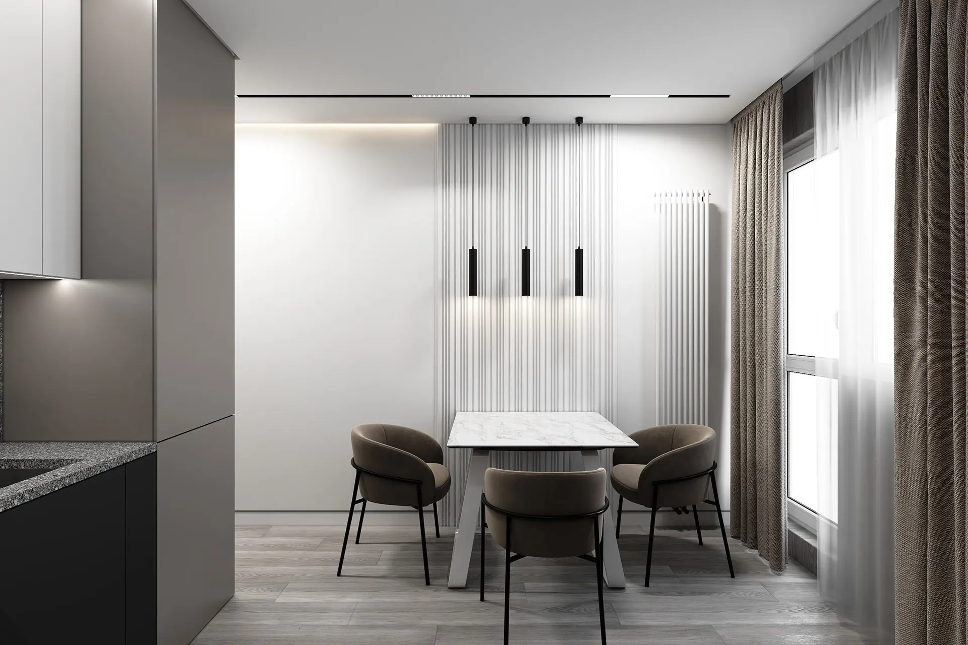 В кухне есть все необходимое для приготовления пищи — раковина, двухкомфорочная плита, холодильник. Стены в прихожей, стулья на кухне и шторы — в одной цветовой гамме. Обогревает пространство вертикальный радиатор, так как в кухне имеется большое окно до пола. Кухонный гарнитур в белых и серых фасадах. Рабочая столешница, раковина и кухонный фартук имитируют мелкий гравий. Все детали интерьера гармонично сочетаются между собой.