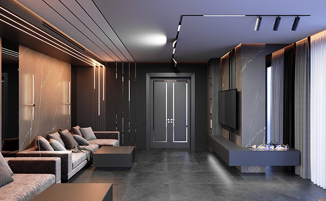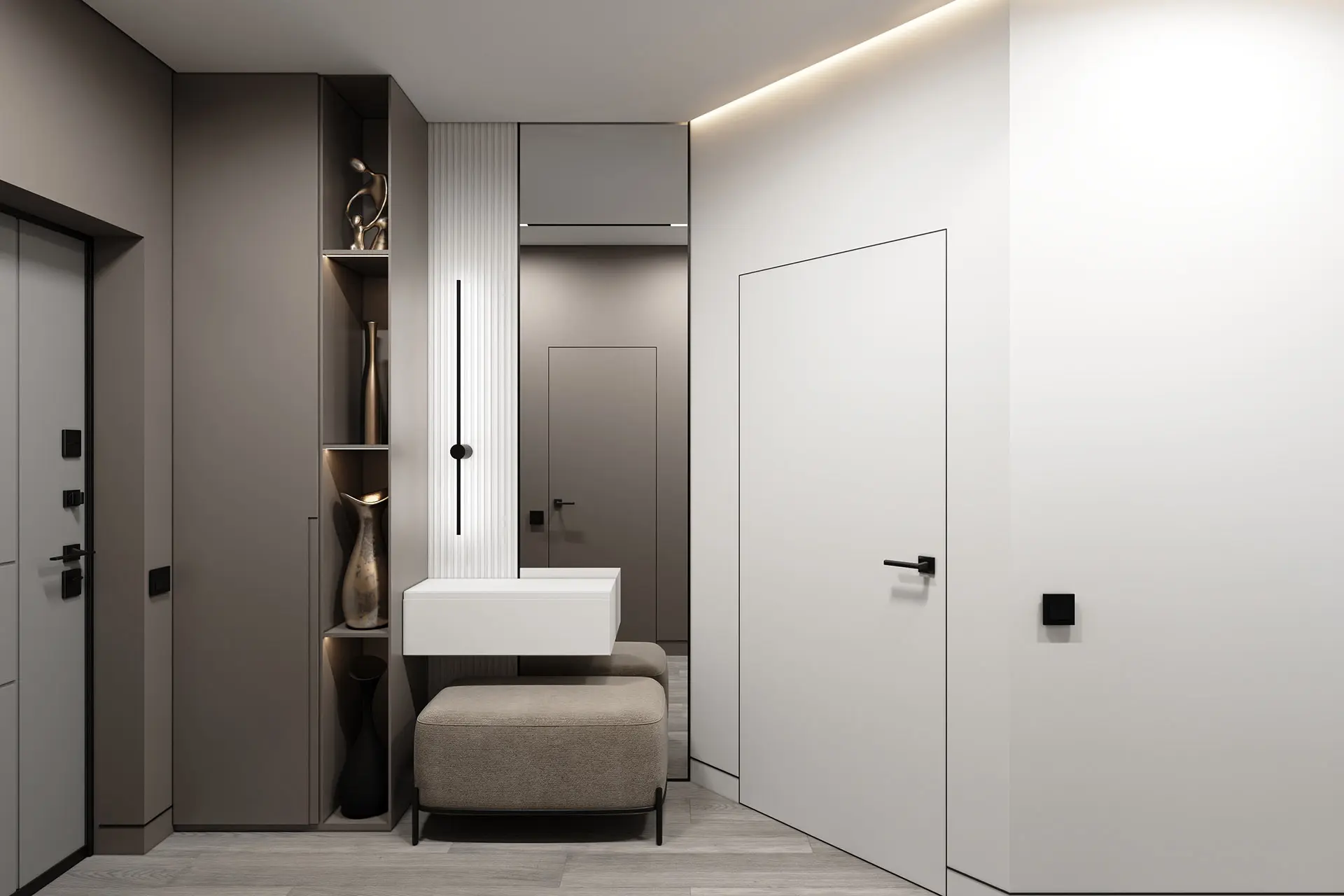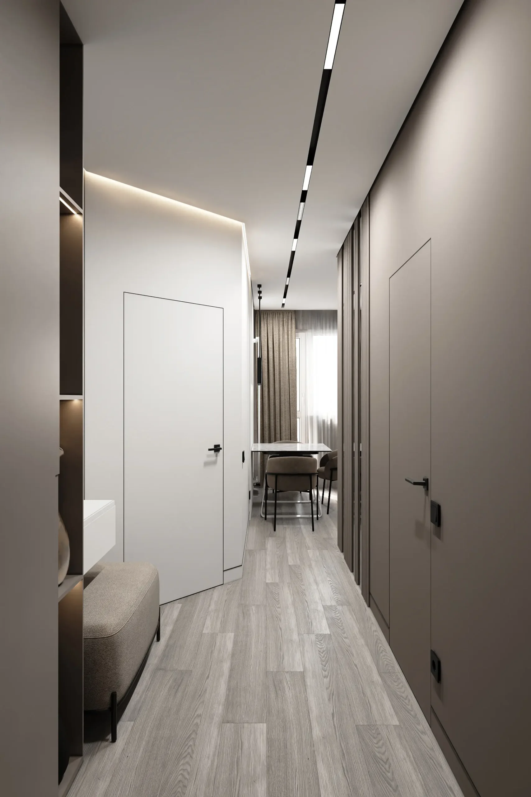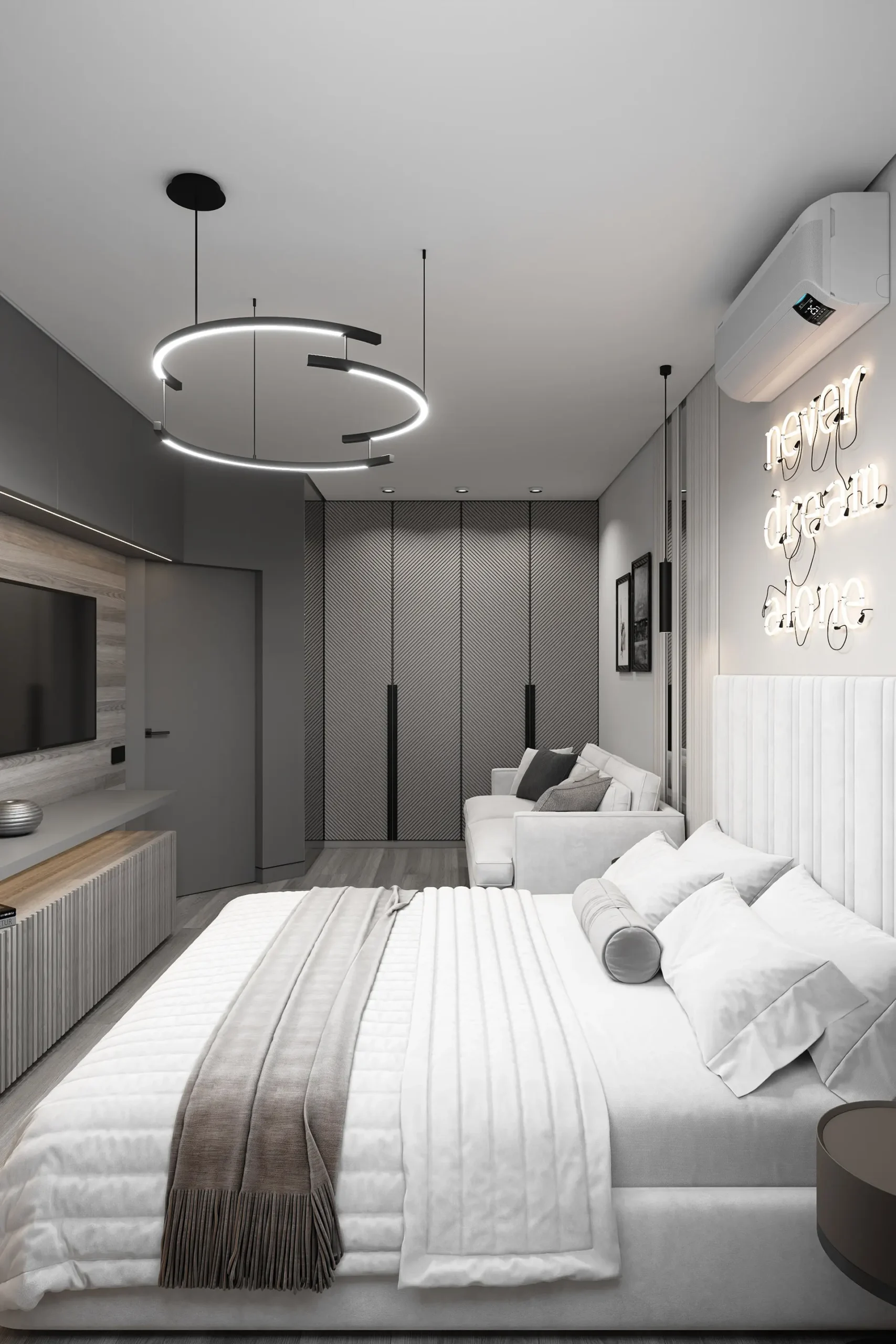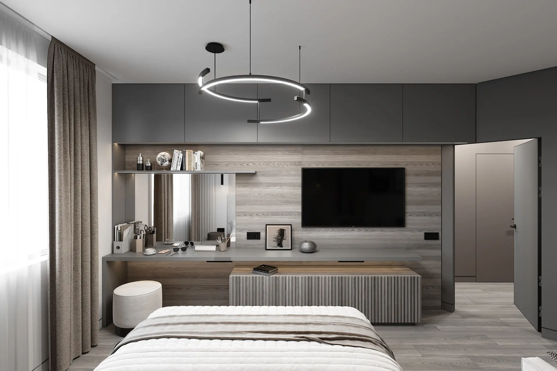 Все вещи спрятаны в так называемых антресолях — встроенных шкафах под потолком, без видимой фурнитуры, и выкрашенные в серый цвет. Благодаря такому решению, они будто сливаются со стеной и не притягивают на себя внимание. Вся остальная спальня выполнена в светлых тонах. Белый постельный текстиль сочетается со светлым диваном. Акценты создают шторы в молочно-шоколадных оттенках, картины, люстра и декор на стене из светящихся букв. Во всей квартире установлено напольное покрытие древесно-серой фактуры. Такая же текстура присутствует на стене, где размещен телевизор.